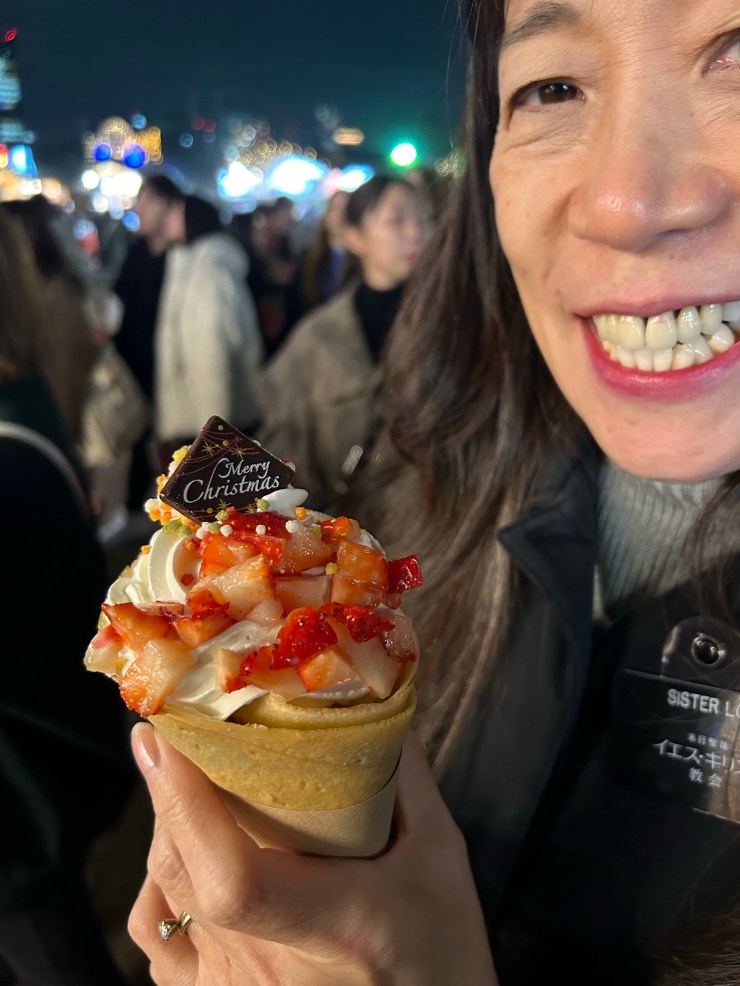 For Family Home Evening this week, Sister Low invited everyone to go with us to the Christmas Market in Yoyogi Park after the meeting. About half of the FHE attendees were able to come with us and we made the walk together up the hill to the park. We gave everybody a Santa hat, and all wore them as we walked through central Shibuya. That got a lot of attention, and passersby who usually say nothing while walking smiled and shouted out to us, “Merry Christmas!” It’s fun to see people start to break out of their shell.