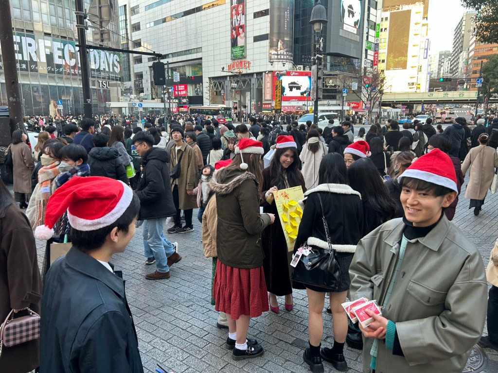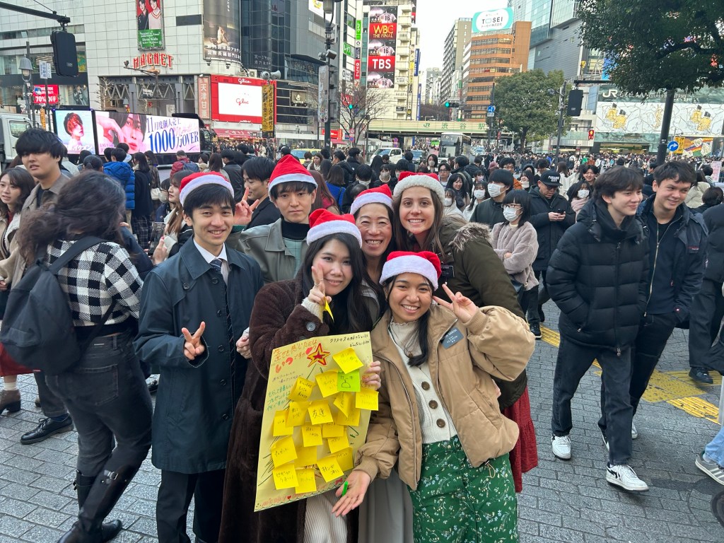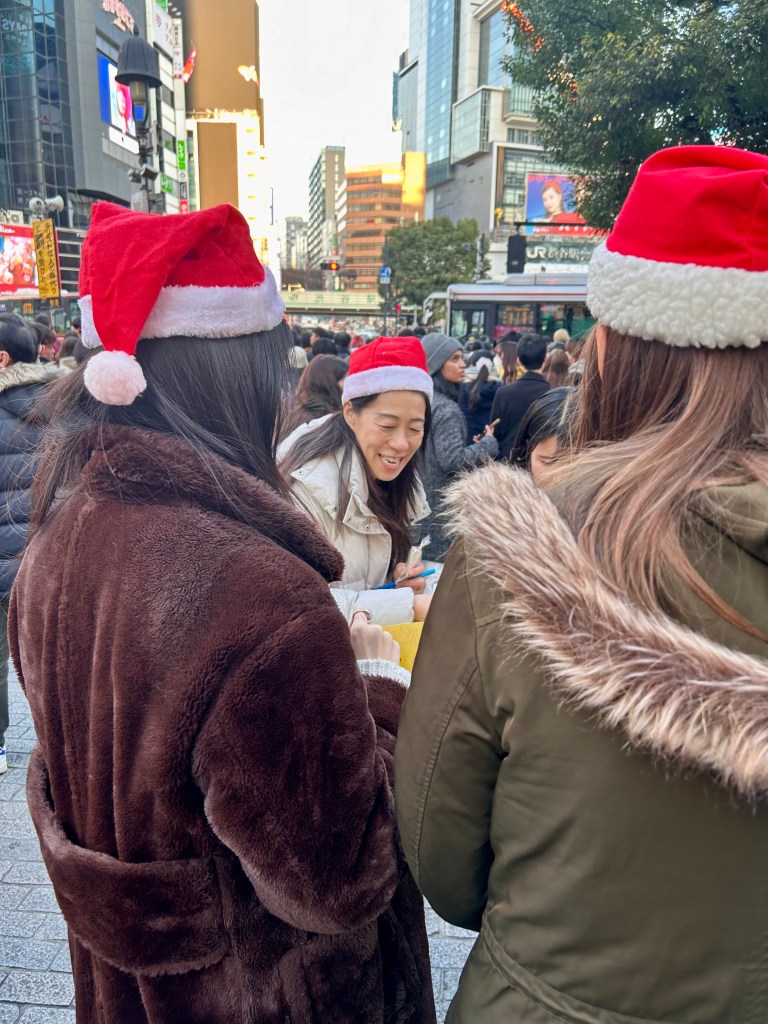 After the luncheon, the branch decided to do a “Christmas Activity” and you won’t believe it. They set up an assembly line and made hundreds of treat bags with pass-along Light The World cards in them. Then we all divided into small groups, put on Santa hats, and scattered into Shibuya and passed out the gift bags to strangers. We also made posters that said, “What’s your favorite thing about Christmas?” and asked strangers to write what their favorite thing was on a sticky note and put it on the posters. We were amazed at how much fun people had writing on the sticky notes while we gave them treats.