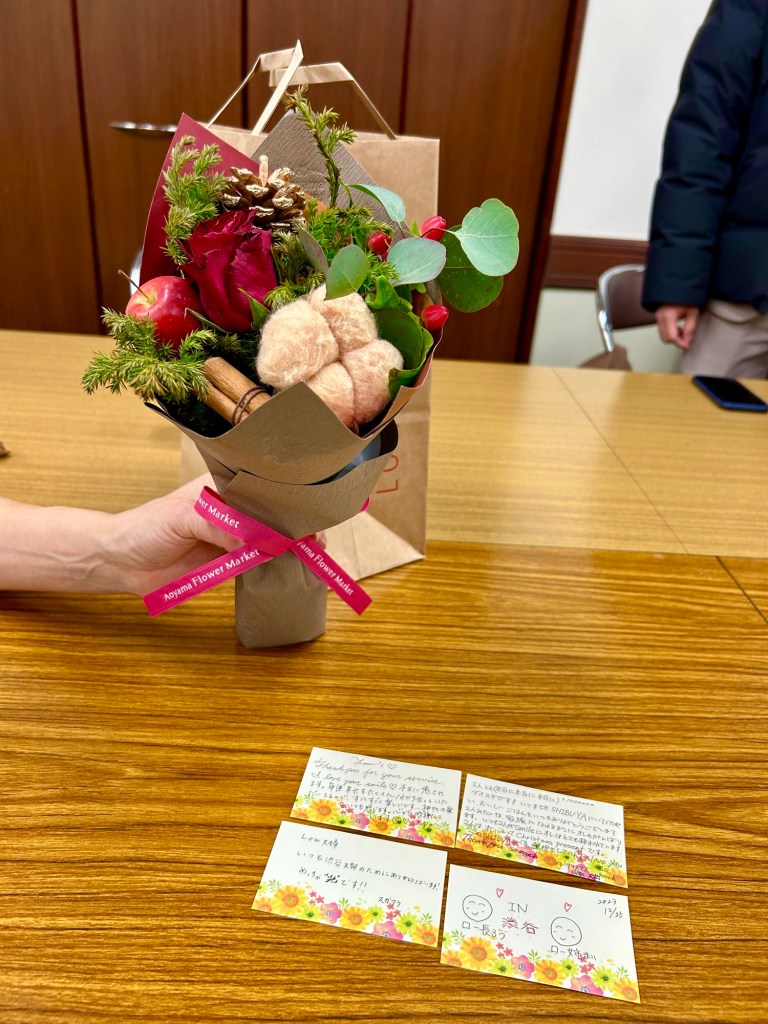 Oh, we did get one real Christmas present on Christmas Day. During Family Home Evening, three of our wonderful YSA members came up to us and gave us a simple bouquet of flowers and a homemade, handwritten card.