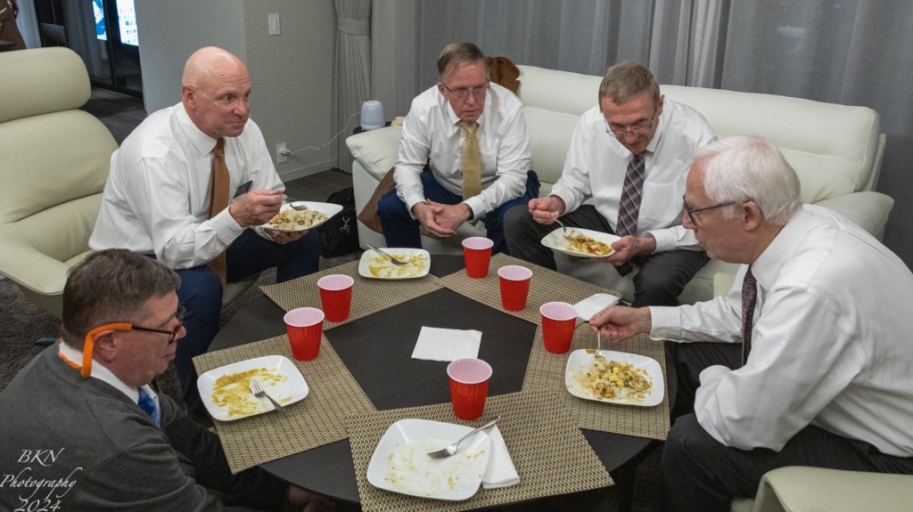 After sacrament meeting Elder Low huddled with our branch president, President Murakami, and we decided we could quickly cook up a lunch so that Elder and Sister Esplin could enjoy a meal with our wonderful YSA kids before heading home. Supplies were already in the fridge. So – Elder Low threw together a big pot of curry while Sister Low cooked up the rice and made cinnamon rolls for dessert. We fed a surprise lunch to 65 wonderful people. It was so fun to be together with them all once again.