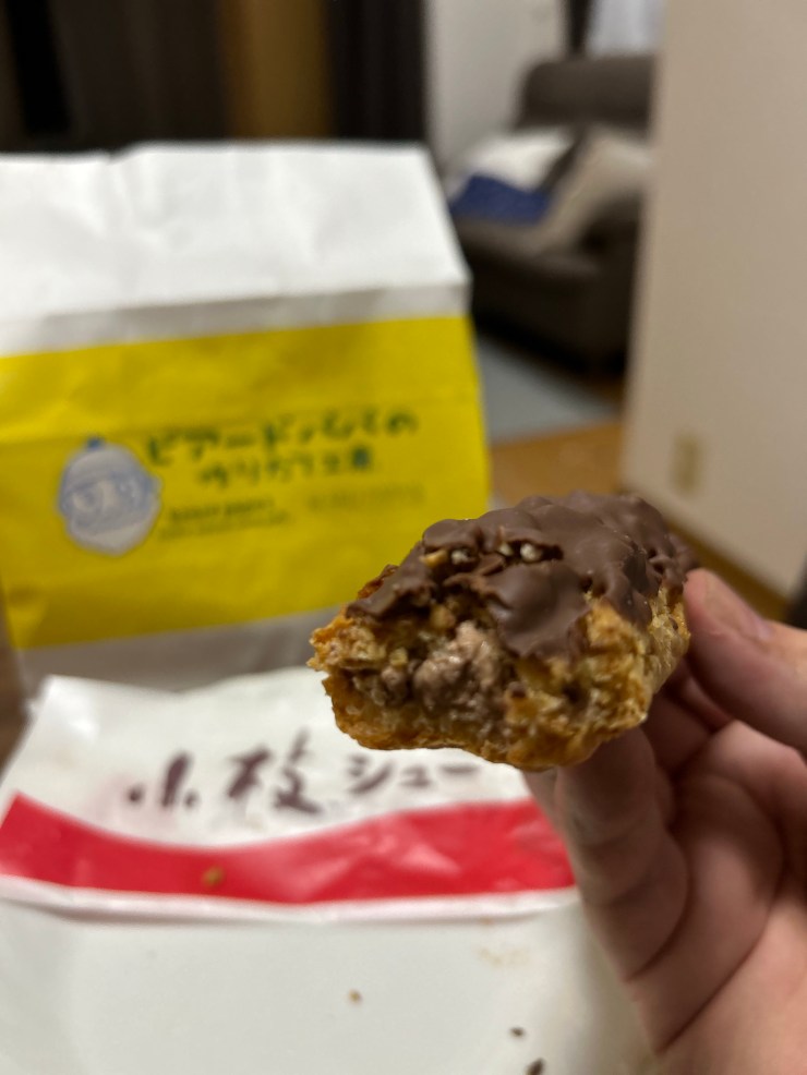 They had this thing called the “koeda” (little twig). It’s an elongated cream puff with chocolate icing and crushed almonds on top. And chocolate custard inside. Different from an eclair. So we picked up two. And a cream puff. Because, why not?
