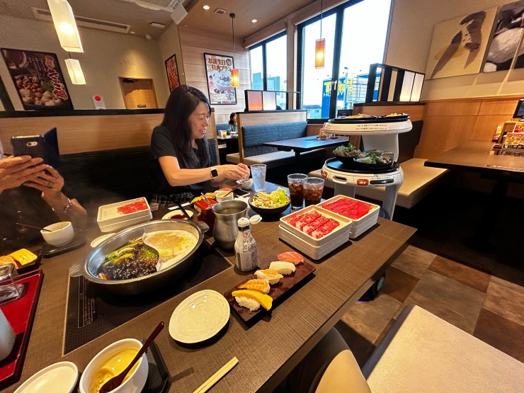 The best part about Shabu Yo is that the food is brought to your table by a robot. When you want more meat, you just tap on the tablet at your table, select which cut you want, and how much, and then a few minutes later, the robot rolls up with your order.