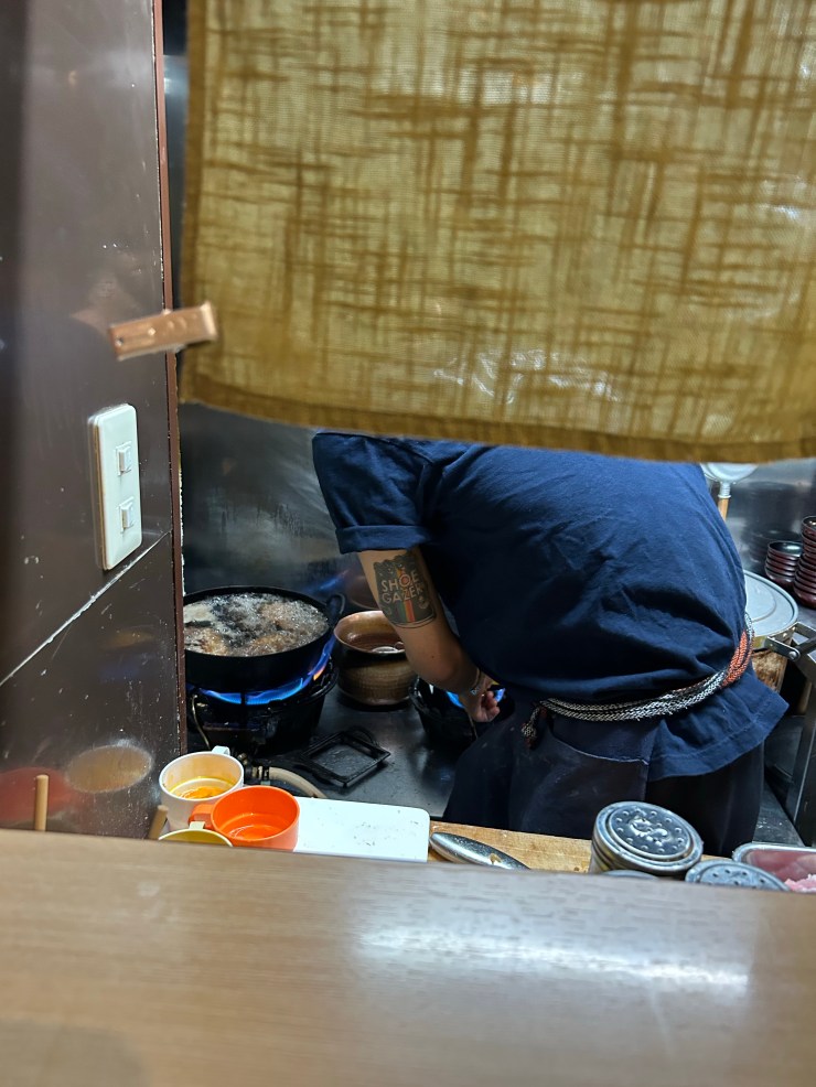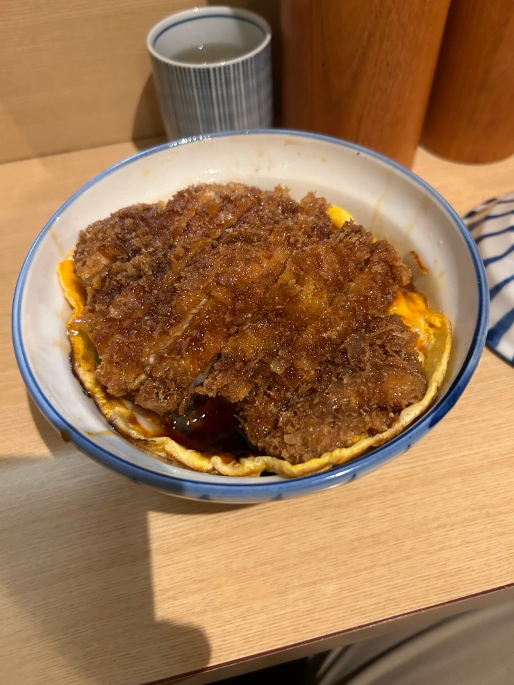 How was it? Really good. Really good. He cooks it different. He cooks the katsu in a Dutch oven – Boy Scout style – and cooks the egg by itself. The egg is overcooked compared to normal katsudon. The base sauce is poured over everything after he puts all the food into the bowl. So nothing is cooked in the sauce. Strange.
