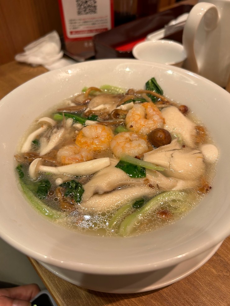 Our meal was truly Michelin Star quality. I got a big stack of steamed dumplings – about 10 different kinds. Saori got a bowl of mushroom soup that had four kinds of wild mushrooms in it, noodles, shrimp and mushroom based broth that was sublime. And some more dumplings.