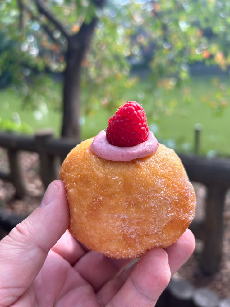 We bought two malasadas. They weren’t cheap. It was $7 for the two of them. One was chocolate filled and the other was raspberry filled.