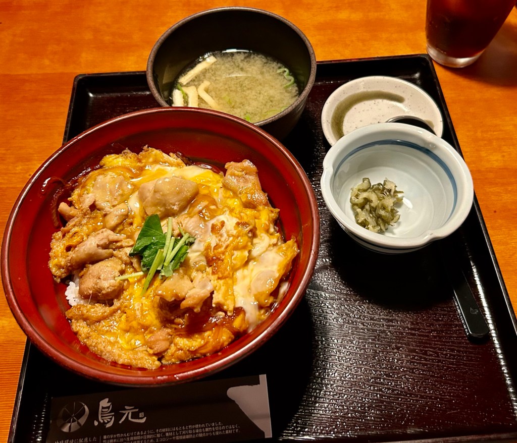 I ordered an oyakodon (“parent and child” donburi). It’s called that because it’s barbecue chicken (the parent) and eggs (the child) over a bowl of rice. I also ordered a couple of skewers of barbecue chicken.