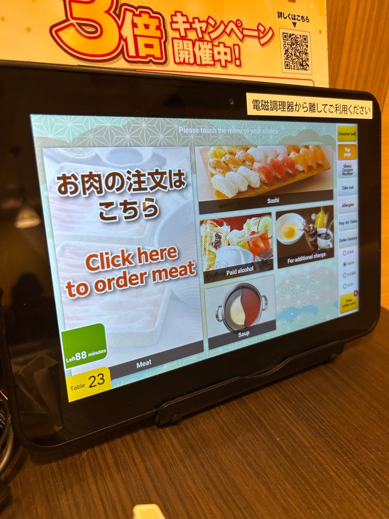 You eat, then reorder, then eat, then reorder, etc., etc. Just keep it coming for 90 minutes. The robots are very effective, because every table is constantly reordering. A human waiter could never keep up.